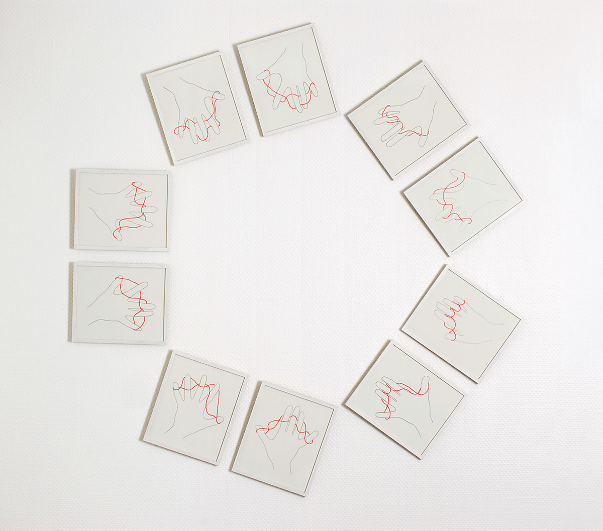 Tischrücken Tischrücken, 1996 10 Bleistiftzeichnungen, rotes Stickgarn, 150 x 150 cm 10 pencil drawings, red embroidery thread, 150 x 150 cm